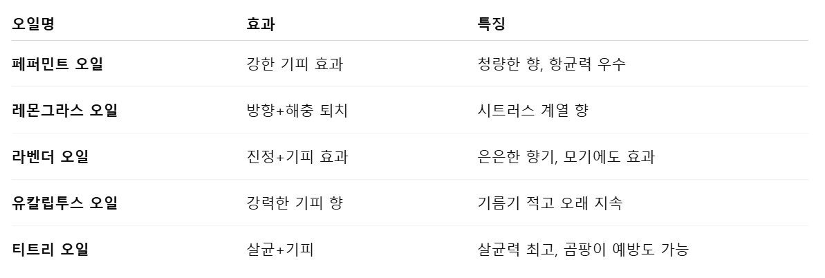 다음은 퇴치 효과가 높은 대표적인 오일들입니다.