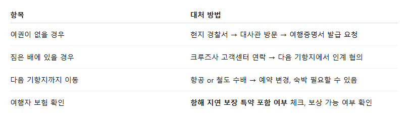 - 일반 보험은 크루즈 일정 지각에는 적용 불가한 경우 많음