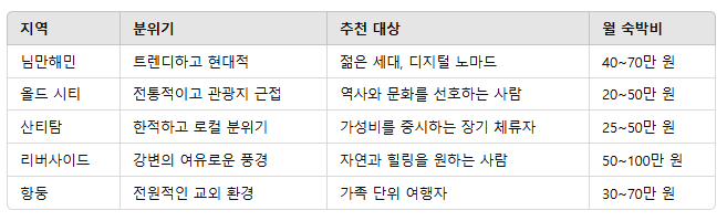 - 중급 이상의 콘도나 현대식 숙소가 많으며, 월 40~70만 원 정도로 임대 가능.