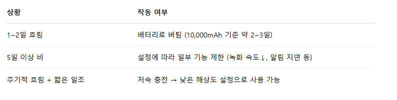 배터리로 3~5일 이상 버틸 수 있어야 함 - 최소 10,000mAh 이상 배터리 탑재 모델 추천