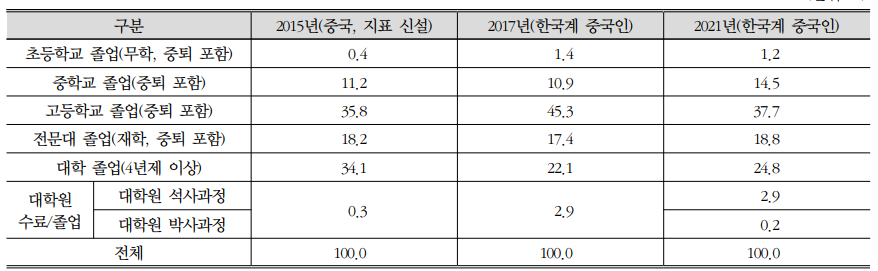 재한 조선족의 학력 형태(서울서베이 도시정책지표조사 2015년, 2017년, 2021년)