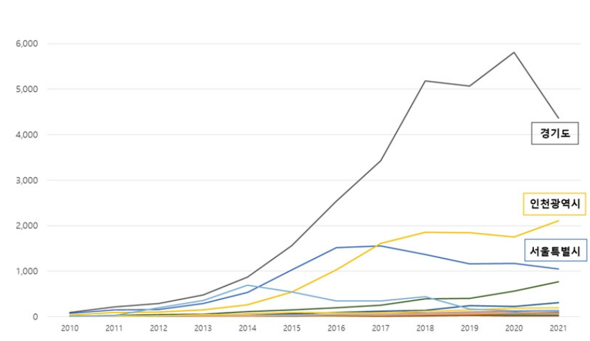 서울시, 경기도, 인천시 중국인 부동산 매매 상위 3개 지역 변화(2010년, 2021년)