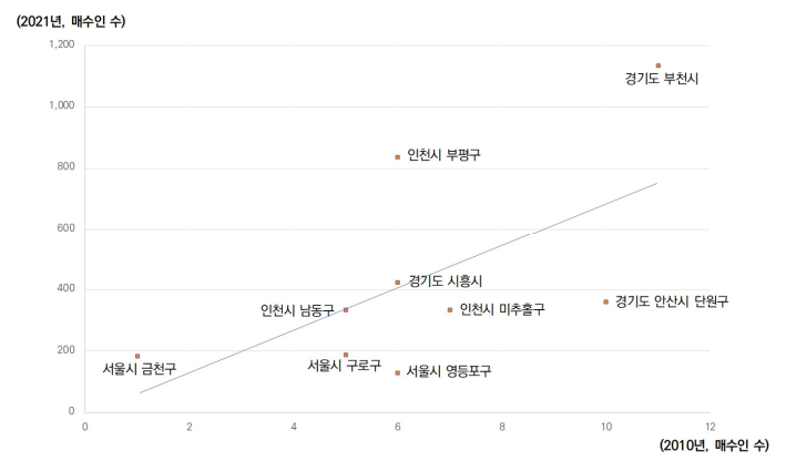 이에 비해 추세선보다 아래에 위치하고 있는 서울시 구로구, 서울시 영등포구, 인천시 미추홀구, 경기도 안산시 단원구는 평균치 미만으로 감소 추세