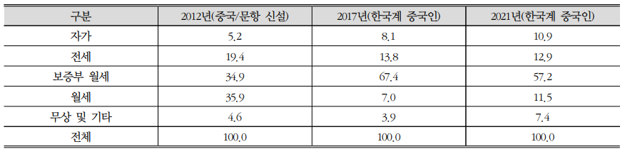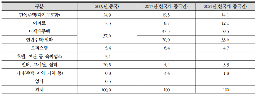 기숙사, 고시원 등 비주택에 거주하는 비율은 2009년 약 21%에서 2021년 3%로 줄어 재한 조선족의 사회경제적 분화에 따라 주거환경도 점차 ‘주거권’을 보장받는 환경으로 변화
