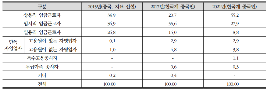 특히 상용직 임금근로자가 2017년 20.7%에서 55.2%로 급증한 것 을 보아 이들의 고용 형태가 점차 안정적으로 변화