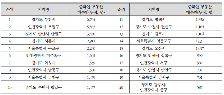 수도권 시군구별 중국인 부동산 매매 총 누적 건수 상위 20개 지역