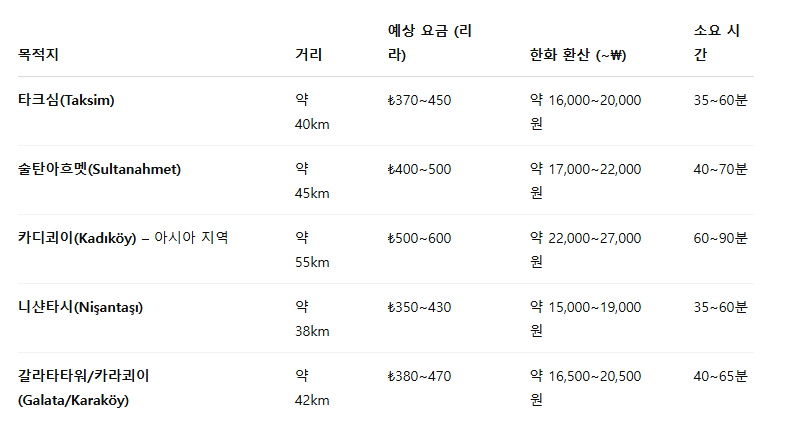 📍 이스탄불 공항 → 시내 예상 요금 (2024년 기준)