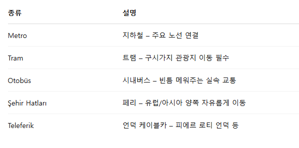 • 지하철(Metro), 트램(Tramvay), 버스(Otobüs), 페리(Şehir Hatları), 케이블카(Teleferik)까지 모두 호환
