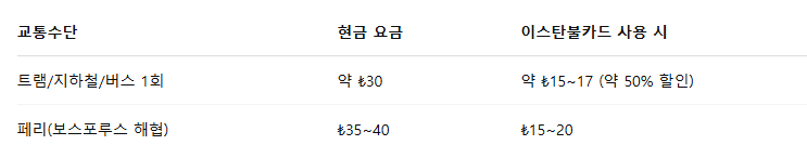 - 지하철(Metro), 트램(Tramvay), 버스(Otobüs), 페리(Şehir Hatları), 케이블카(Teleferik)까지 모두 호환