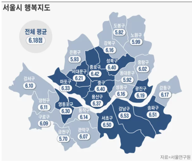 - 강남구의 행복도가 6.53점으로 가장 높았고, 송파구(6.51점), 서초구(6.50점)의 순
