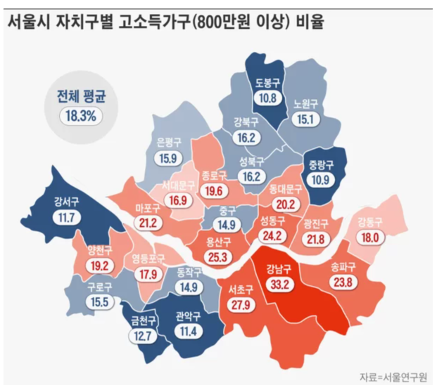 - 고소득 가구 비율이 33.2%로 25개 자치구 중 가장 높은 강남구가 행복도도 가장 높았음