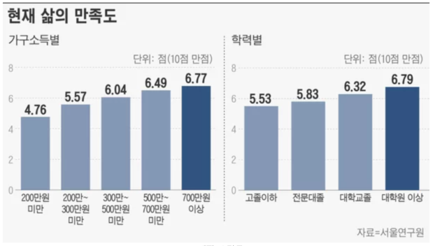 - 평균 6.18점으로 가구소득이나 학력수준에 정비례