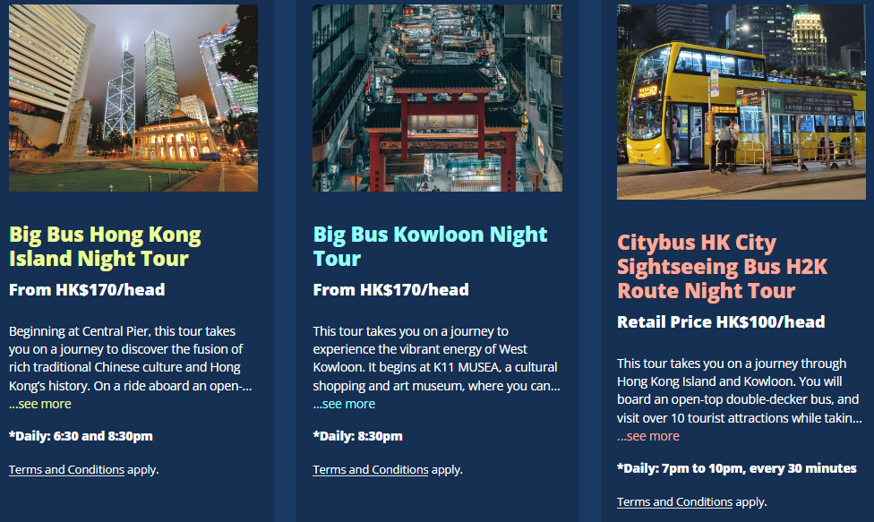 - 주요 특징: 전통 중국 문화와 홍콩의 역사를 탐험하는 투어로, 오픈탑 버스를 타고 홍콩 아일랜드의 야경을 즐길 수 있습니다.