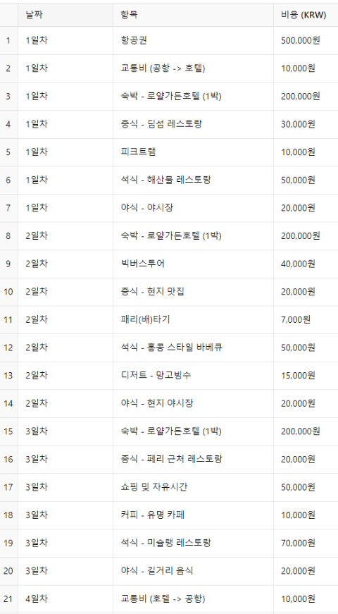• 기타비용: 여행 중 발생한 기타 소소한 비용
