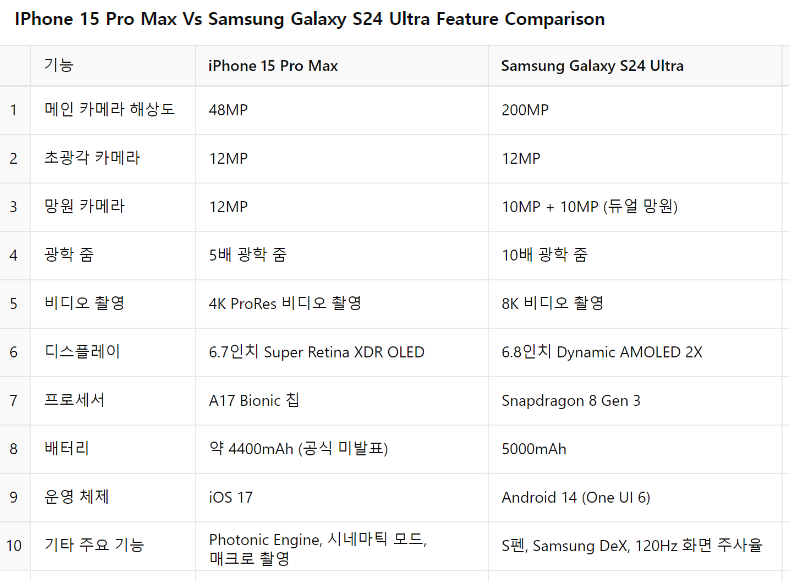- 기타 주요 기능: Galaxy S24 Ultra는 S펜과 Samsung DeX 등의 추가 기능을 제공하며, 다목적 사용에 유리합니다. iPhone 15 Pro Max는 Photonic Engine, 시네마틱 모드와 같은 사진 및 비디오 관련 기능에서 강점을 보입니다.