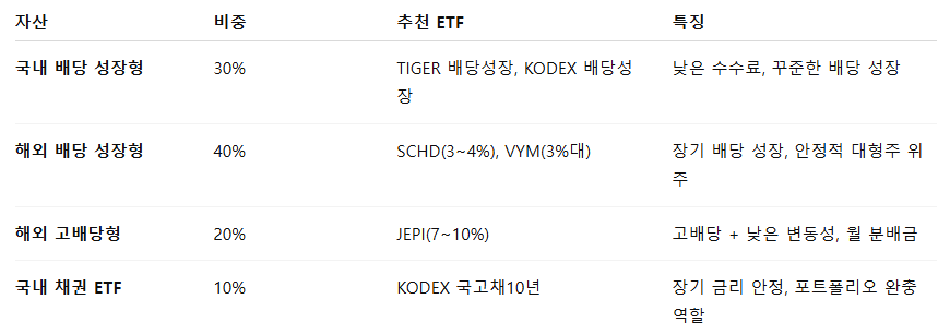 - 장기 투자자(10년 이상): 고배당 + 배당 성장 ETF 위주로 비중 확대