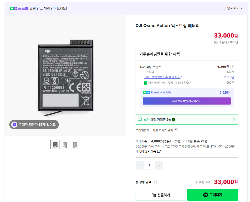 - 🔹 DJI Osmo Action 4 배터리 키트 (배터리 3개 + 충전 허브)