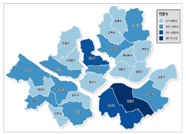 평생교육시설은 일자리 중심지인 동남권(서초구, 강남구)에 가장 많이 위치하여 동북권, 서북권 의 경우 상대적으로 부족