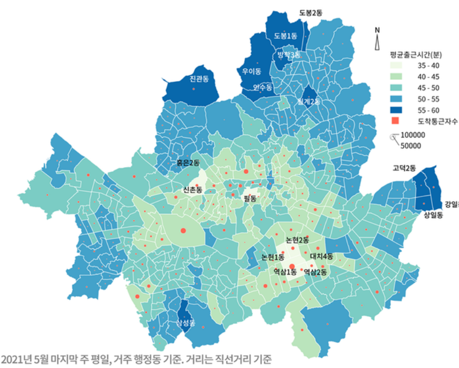 시 평균 통근(학)시간 37.4분에 비하여 동북권의 강북구(42.3분), 노원구 (41.6분), 서남권의 양천구(42.8분), 영등포구(39.8분) 소요시간이 김