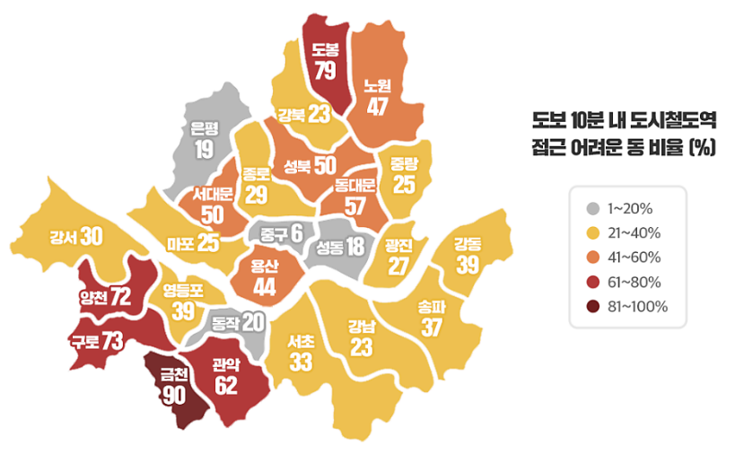 - 대중교통 접근성 하위 자치구 : 금천구(22.6%), 관악구(33.7%), 양천구(41.4%)