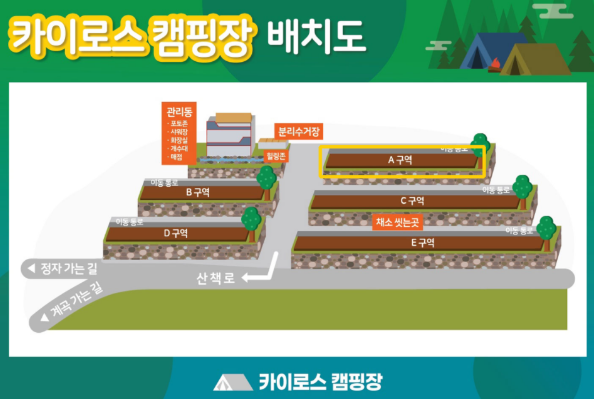 경사지역에 위치하여 모든 사이트에서 전망이 확 트여있는 것이 가장 큰 장점이다. 나의 경우 A구역을 이용했는데 충주호 조망이 가능하고 관리동 이용이 편리해서 대만족이었다. D구역은 캠핑장 끝단 가장 아래쪽에 위치해 조용하지만 저 비탈길을 오르내리느니 차라리 A구역이 좋을 듯하다. 워낙 소규모로 관리가 잘되어 있고 전 사이트 2인 전용이라 사실 구역이 큰 의미가 없을 수 있다.